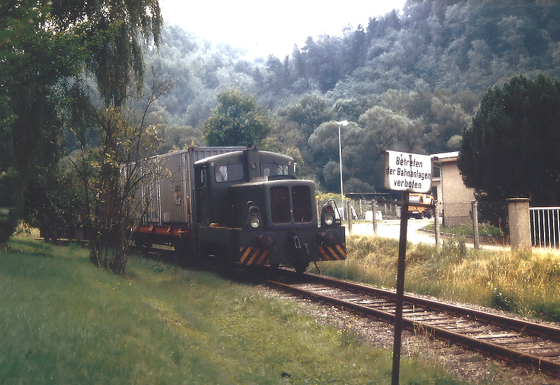Die V 10 B (ehem. NVA) der Bundeswehr bringt 2 4-Achser mit Containern für das Bundeswehr-Lager von der Wagen-Übergabestelle. Der enge Gleisbogen erzeugte durch das Zwängen bei den Fahrten derartige Quietschgeraüsche, dass wir Kinder schon die Idee hatten, deswegen die Schienen zu ölen... Die erwachsenen haben uns allerdings dringend davon abgeraten!